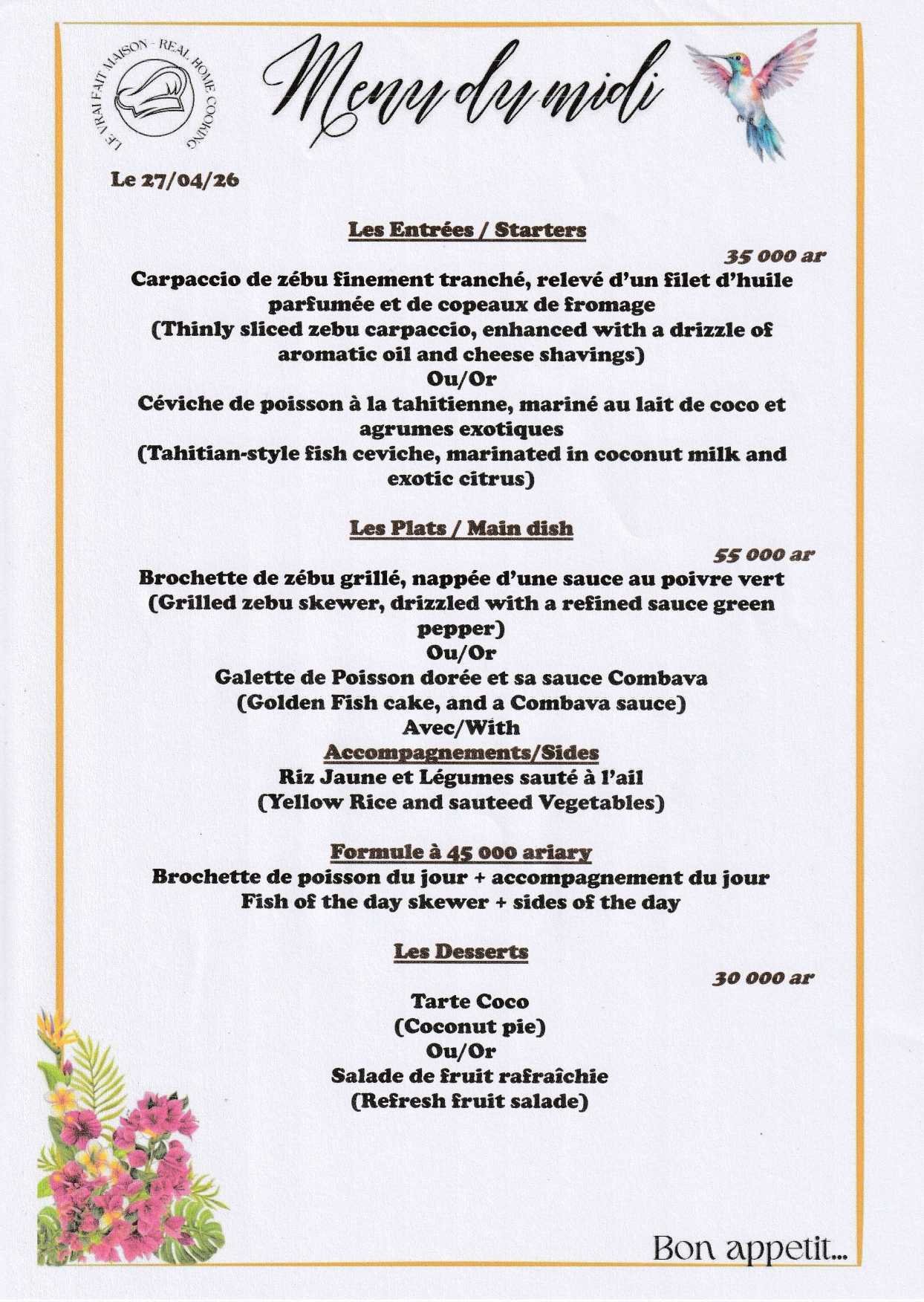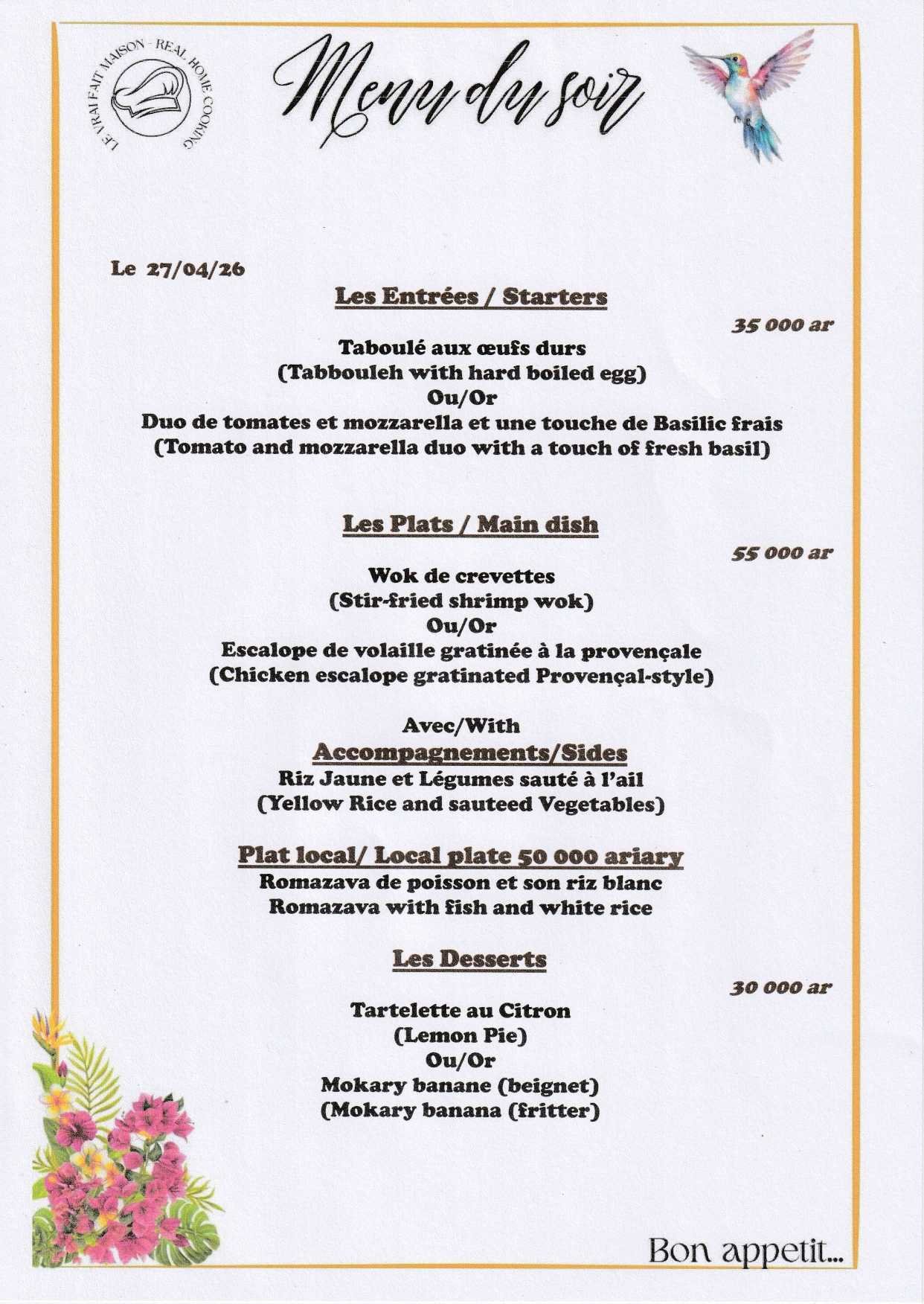 Menus du Midi et du Soir