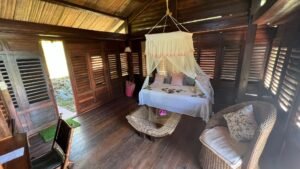 Plongez dans une expérience authentique au Manga Soa Lodge avec cette suite tropicale ventilée, nichée au cœur d’un jardin luxuriant, offrant une vue imprenable sur l’océan Indien. Conçue en bois et inspirée de l’architecture locale, cette suite allie charme naturel, décoration artisanale malgache et confort moderne. Idéale pour un séjour dépaysant à Madagascar, elle propose un cadre intime, une ambiance chaleureuse et une immersion totale dans la nature. Profitez d’un hébergement de charme avec vue sur l’océan, parfait pour une escapade romantique, un séjour détente ou une expérience unique en lodge tropical.